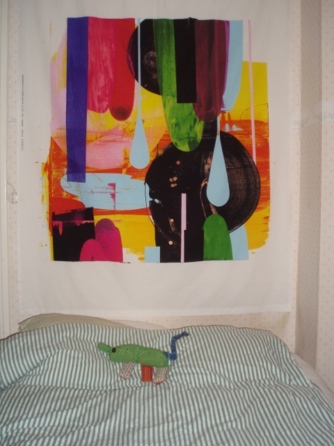 Kun kuistin luomuverhot vaihtuivat, tuli sisälläkin into sisustamiseen. Lahjaksi tullut hieno taidekangas muutti ikkunan edestä sängyn päätyyn ja sai seurakseen takakannen Tampereen nykytaiteen museon 20-vuotisjuhlakatalogista. (Samalla peittyi nuhraantunut ja repeytynyt tapettikin.)