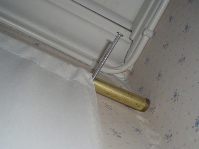 Olin oppinut läksyni edellisestä verhotangon ripustuksesta: otin kaksi naulaa, löin ne seinään ja ripustin tangon niiden väliin.