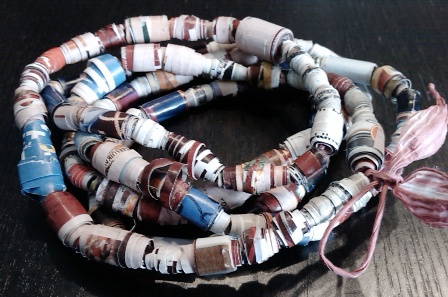 Postilaatikkoon tulee ihan järkyttävät määrät mainoksia. Osan voi hyödyntää joululahjoiksi niin että rullaa suikaleista ’helmiä’ (tai rullia tai ruttuja, taidoista riippuen) ja kokoaa niistä kaulanauhan. Nämä rullasin sukkapuikon ympärille: keskelle jäi juuri sopivan kokoinen reikä paperinarulle. Liimaa olisin saanut käyttää runsaammin, sillä suikaleet lähtevät avautumaan aika helposti.