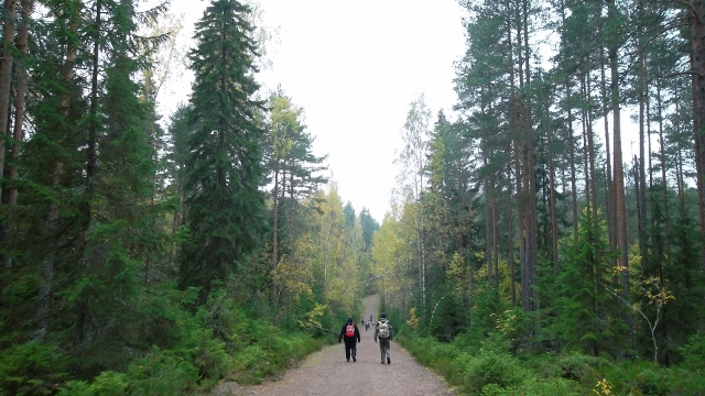 Nokipannukahvin ja naku-uinnin jälkeen käännettiin pyörät ja lähdettiin takaisin Evokeskukseen. Alkoi sataa vettä: paita ei enää ollut hikinen. Sitten tuli rakeita: ropina kuului kypärään. Kura roiskui eteen ja taakse, kun kiidettiin metsätietä pitkin. Rillit kastuivat ja huurustuivat, selässä oli rapaviirut, pohkeet saivat hiekkapesun.