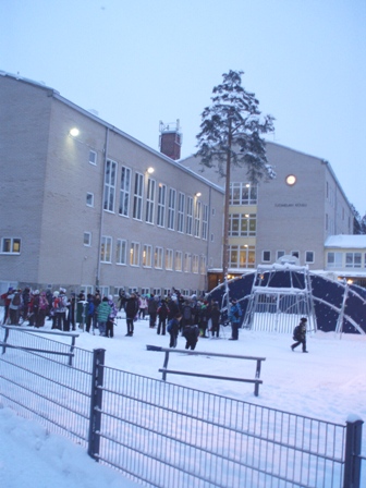 Kuva otettu ennen yhdeksää, jolloin luokat ryhmittyivät pulkkineen, luistimineen, suksineen ja muine ulkoiluvälineineen opettajien ympärille pihalle ja jatkoivat siitä kuka mihinkin kohteeseen.