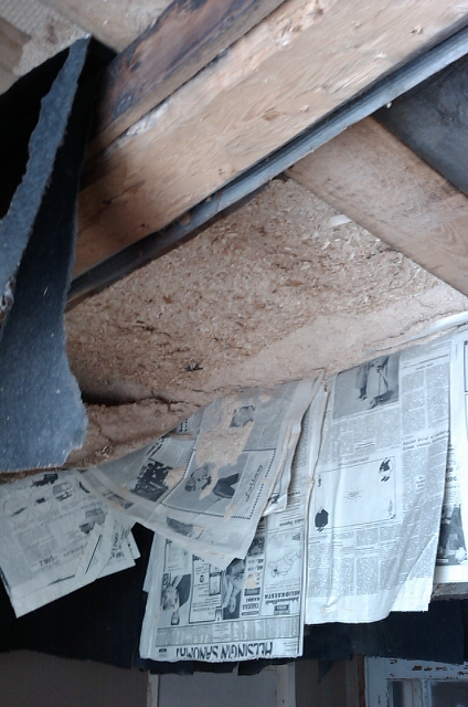 Tästä alettiin täyttää selluvillalla. Ensin sammaleen tilalle tuli 50-millinen levy, sitten lautakerroksen päälle satamillisiä laattoja kolme päällekkäin. Seinänvierustat vuorattiin selluvillan pystypalasilla.