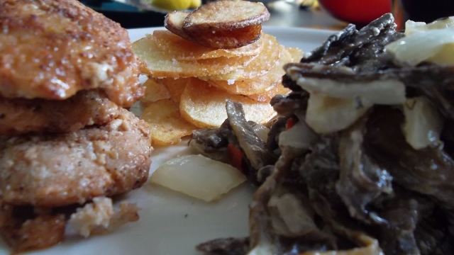 (Lapset söivät kaupan valmiita jauhelihapihvejä ja lämmitettyjä paistettuja perunoita.)