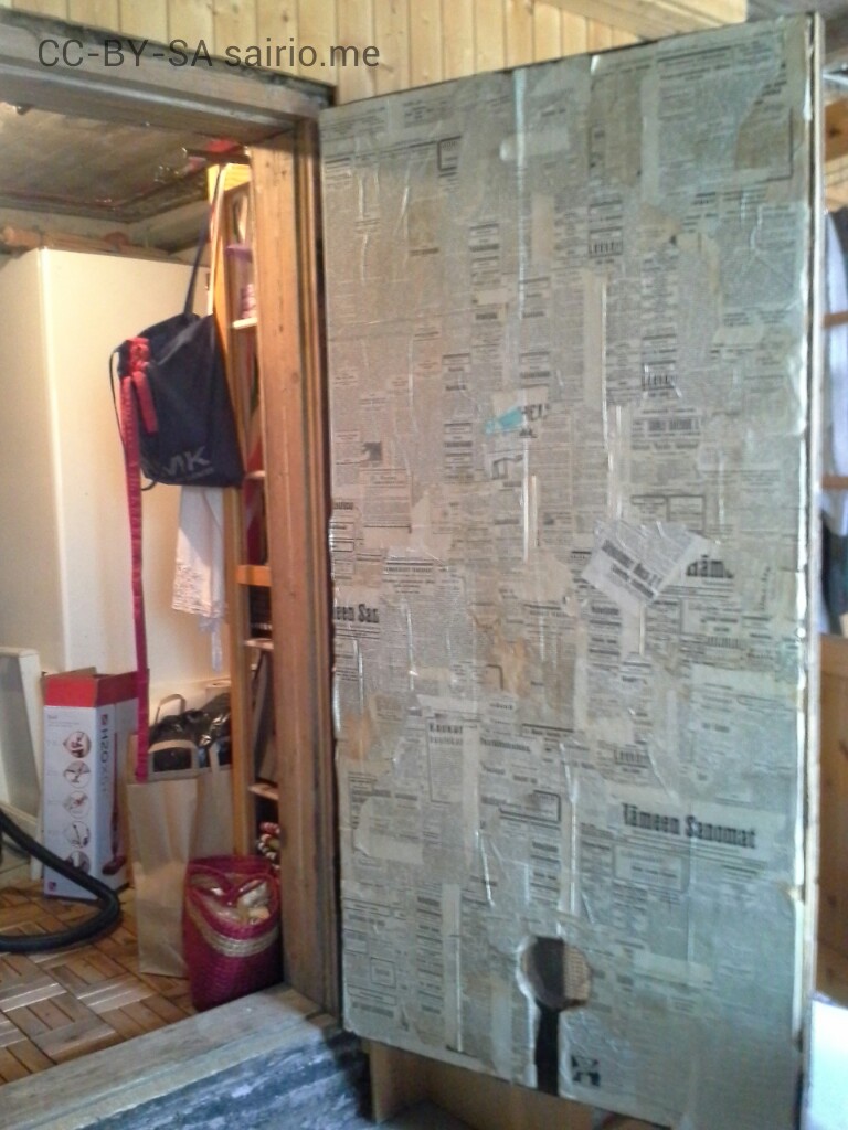 Tapetoin alakerran vanhan varastokopin oven sanomalehdillä. Liisterin kanssa on mukava läträtä, sillä se ei ole niin nokon nuukaa hommaa – jos ei oikeasti tapetoi: harjalla reilu kerros liisteriä oven pintaan, sitten sanomalehden kappaleita kiinni niin, että kiinnostavimmat lukupalat jäävät päällimmäisiksi ja niin, että päätä ei tarvitse turhaan käännellä.