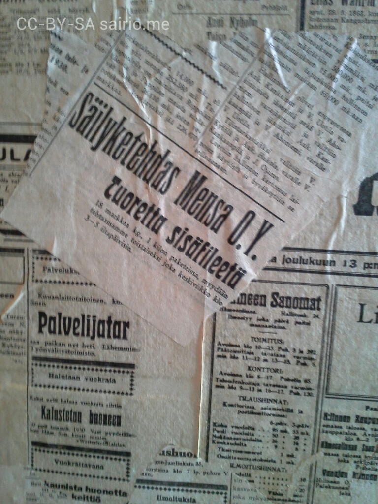 Makkariremontin yhteydessä lattian alta paljastui nippu vanhoja Hämeen Sanomia. Lattiaa oli kai eristetty loppuvuodesta, sillä purujen seassa oli paljon syyskuun ja joulukuun lehtiä, ja varsinkin joulukuun 8. päivän aviisia oli useita kappaleita. Ja myös useina kappaleina: osa lehdistä oli ehjiä ja kokonaisia, mutta paljon oli purun alla silppuakin. Kokonaisia lehtiä koetin ottaa varovasti talteen, mutta pienemmät säpäleet uhrasin surutta sisustuksen alttarilla.