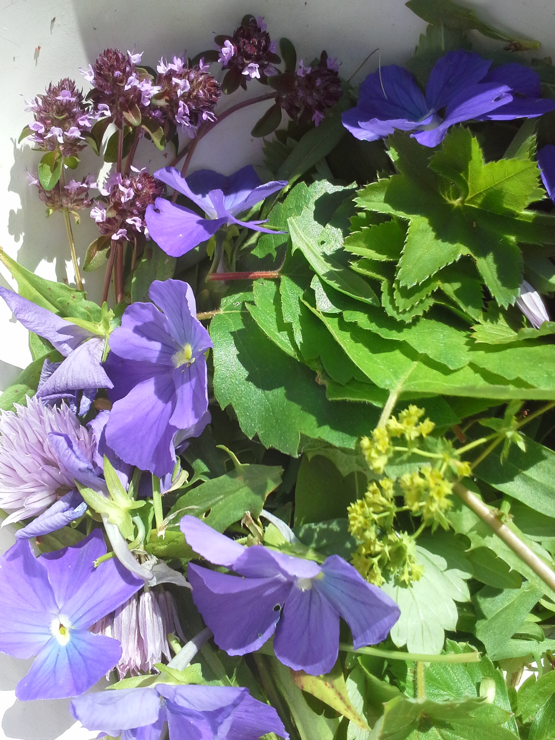 Orvokkia, poimulehteä, ahomansikkaa, koivua, voikukkaa, mäkimeiramia tavallisen lehtisalaatin päällä. Ei siis eletty vain grillimakkaralla!