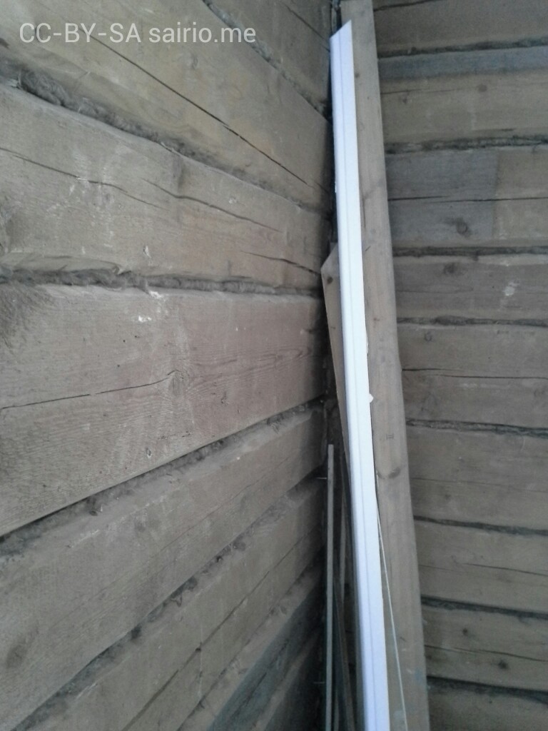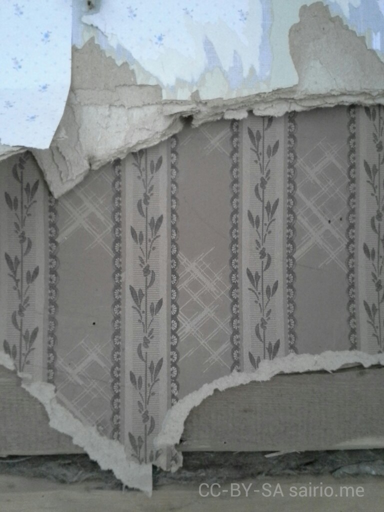 Ensin pinkopahvi ja paperitapetti. Sitten reilun sentin paksuinen puukuitulevy, jonka päällä toinen tapetti ehkä 1950-60-luvulta. Ja tämän päällä 1990-luvun tapetti.