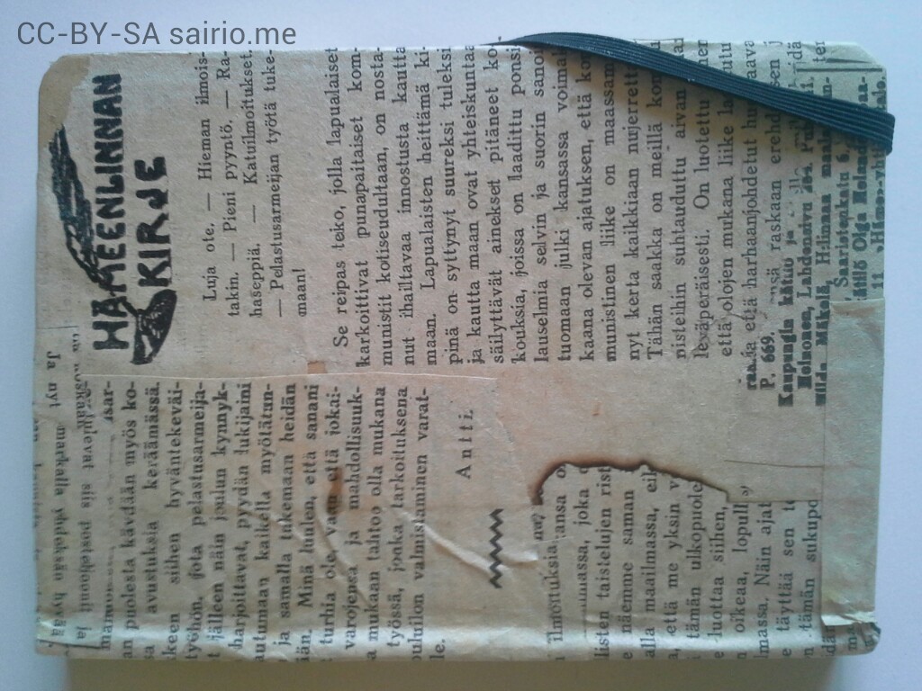 Liisteriä jäi ämpärin pohjalle vielä kun seinät oli tehty. Se käytettiin sitten askarteluun: päällystettiin vapulta jääneitä ilmapalloja sanomalehtisuikaleilla; pahvinen lehtikotelo lattian alta löytyneillä sanomalehden palasilla; kellarin teknisen tilan oven sisäpuolen kuitulevyt samaisilla sanomalehdillä ja vielä yhden pikkuisen muistikirjan kannet vuoden 1929 Hämeen Sanomalla. (Lehdessä nykyäänkin Hämeenlinnan kirje -palstaa pitävä ’Antti’ ottaa kantaa ajankohtaisiin tapahtumiin: ”Se reipas teko, jolla lapualaiset karkoittivat punapaitaiset kommunistit kotiseudultaan, on nostanut ihailtavaa innostusta kautta maan.” Reippaushan sitten jatkui Lapuan liikkeenä.)